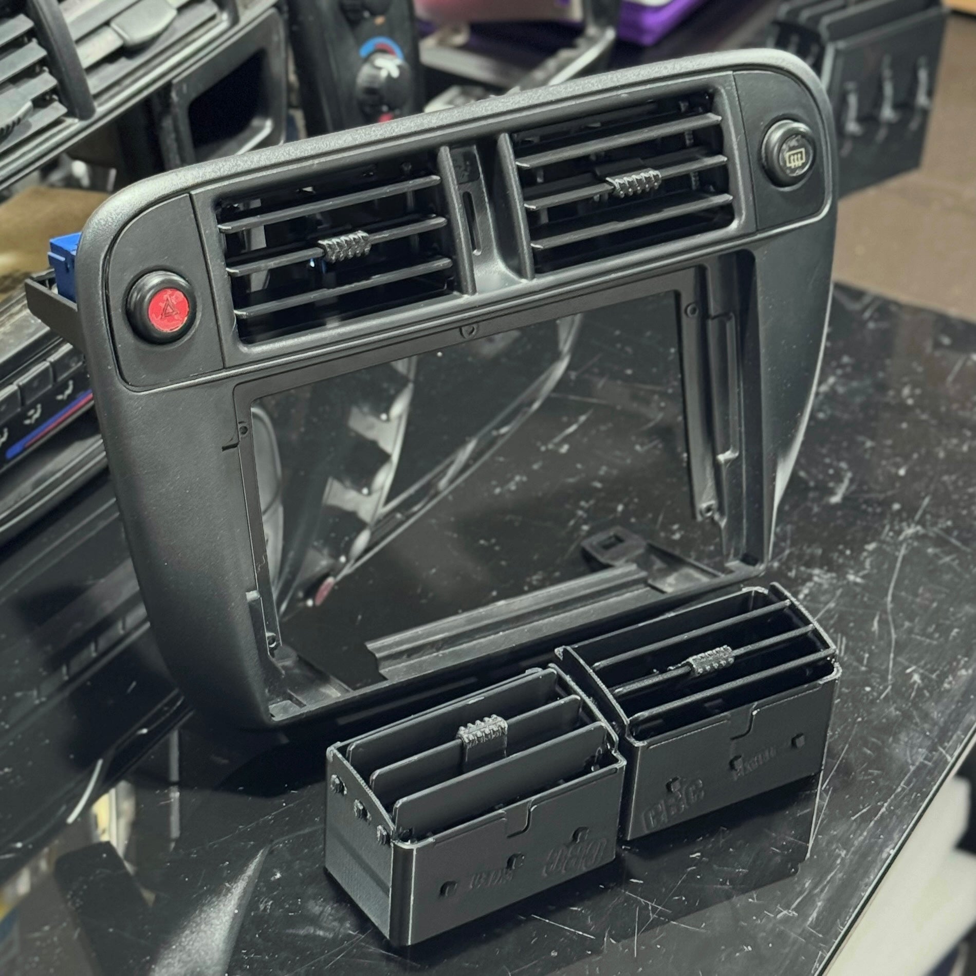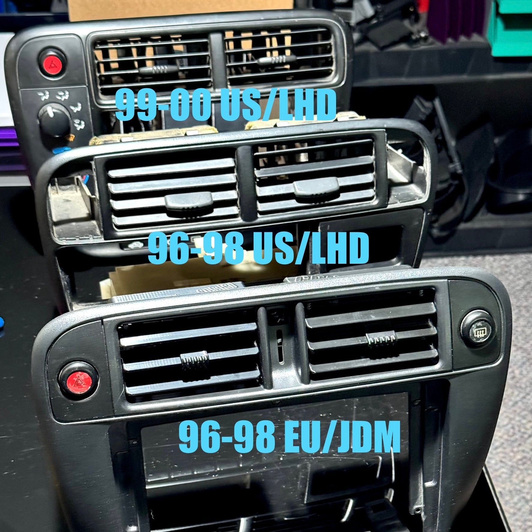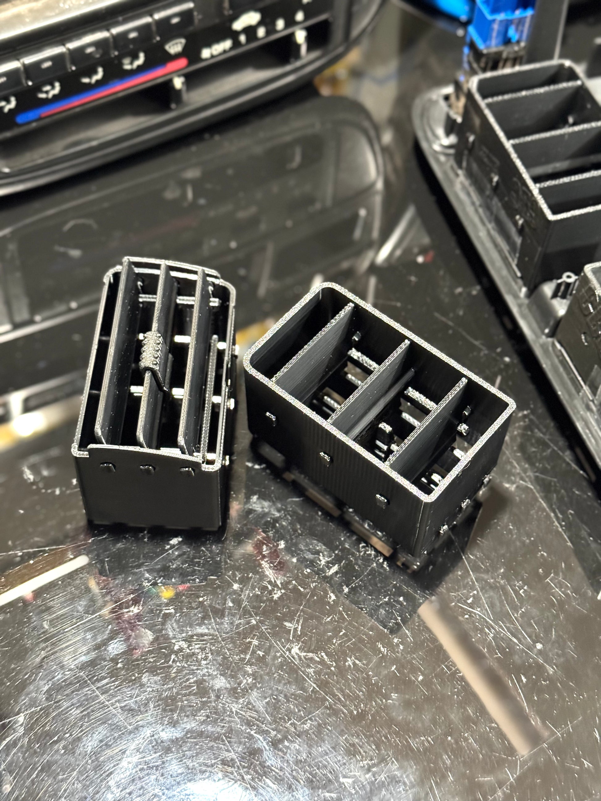 Ducting and all redesigned ground up with thicker fins, larger braces, and with 2 braces on each set of fins (rather than 1 on oe trims) to help ensure a longer life. The number of fins has also been reduced to 3 to look more even and maintain air volume, yet the fins are deeper than originals to provide sufficient surface area to direct air where desired