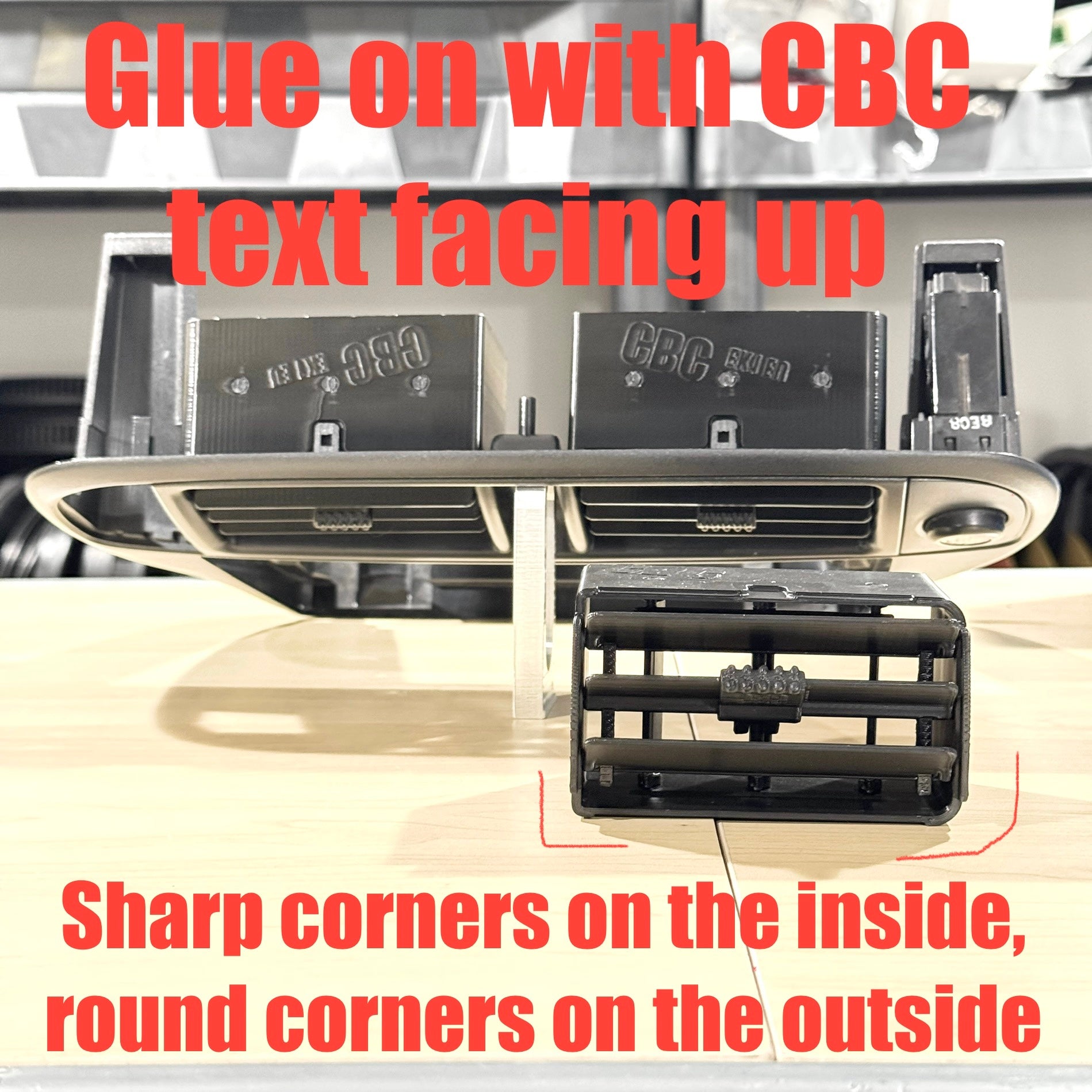 BEFORE APPLYING ADHESIVE CHECK THAT THE VENTS ARE FIT TO THE CORECT SIDES AND ONLY GLUE THE BACK OF THE RADIO TRIM AROUND THE PERIMITER WHERE THE VENTING TOUCHES - IF YOU GLUE THE FINS THEY WILL NO LONGER MOVE